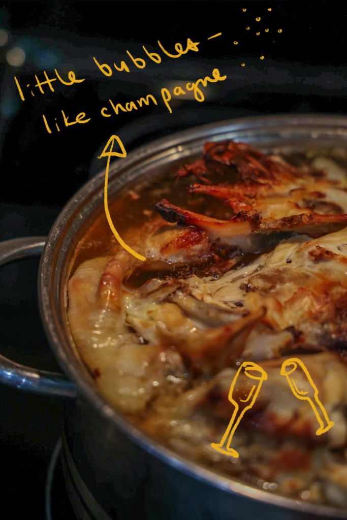 In your stockpot, add the roasted chicken and 2.5 litres of water (or enough to just cover the chicken). Leave the vegetables out for now. Bring everything to a boil, then reduce to a very gentle simmer.