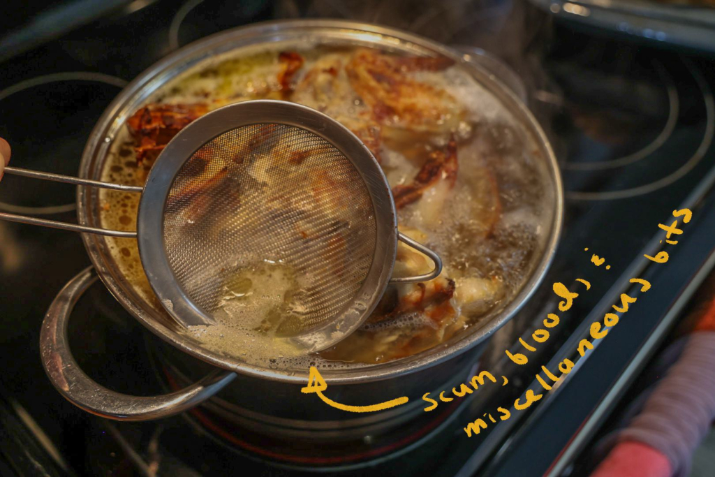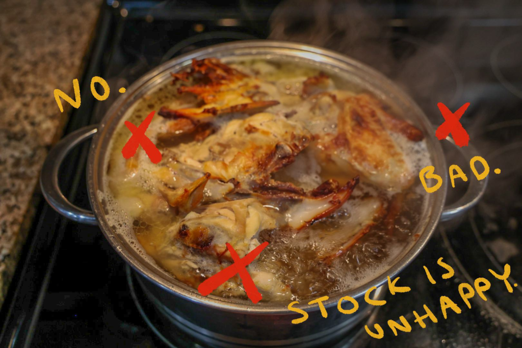 Why do we simmer, not boil? YOU MUST SIMMER LOW AND SLOW. It’s cost me gallons of murky stock, but I’ve learned that stock making is not a race. I used to think there wasn’t much difference between simmering and boiling. I thought one just cooked the food faster. If the only thing standing between me and a bowl of chicken noodle soup is the cook time, let’s crank the heat up to eleven and get to slurping sooner! Boiling water is hotter and more turbulent than simmering water. Water boils at 212°F (100°C). Water simmers at 185°F to 205°F (85°C to 96°C). The heat and vigour of a full boil will emulsify fats, proteins, and other gunk with your water, resulting in a greasy, bland, and (if you care about visuals) cloudier stock. Note: The rule to simmer doesn’t apply to all everything. East Asia, for example, has a penchant for boiling the ever-loving shit out of bones. Recipes will have you intentionally emulsify fat and protein with the water, making a gorgeous, velvety, milk-white stock. More on this later. |