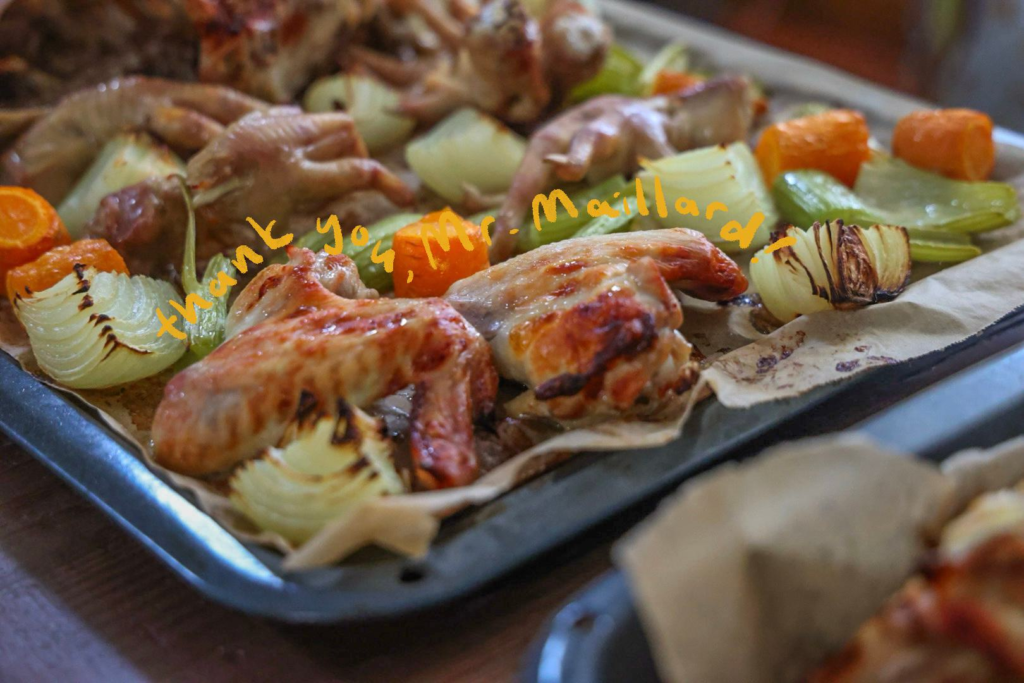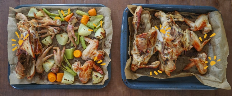 Oil 2 baking pans and spread the chicken bones, chicken wings, and vegetables across the pans in a single layer. This helps achieve an even browning.